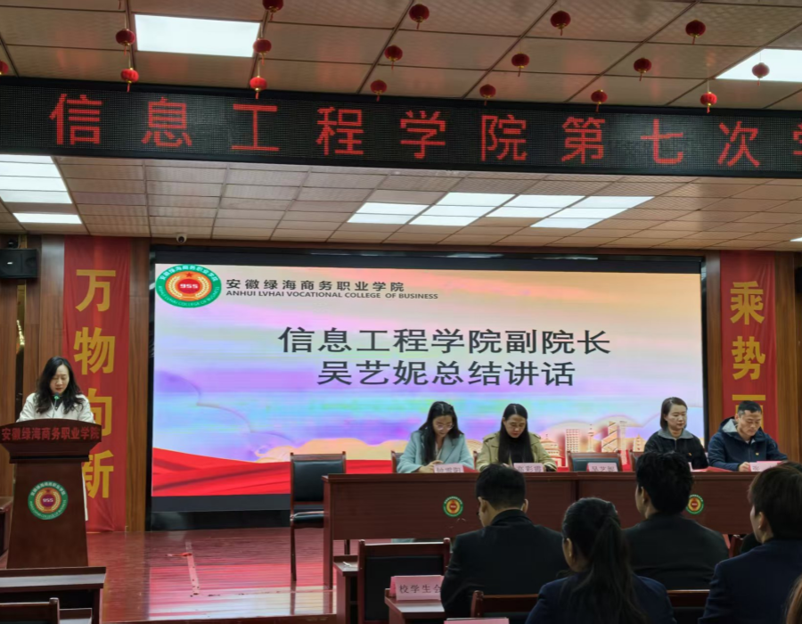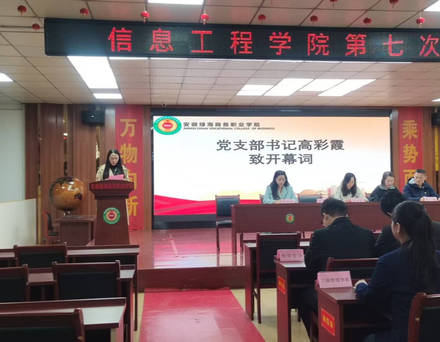 为明确学生会工作方向、凝聚青年学生力量,在学院领导关怀与师生共同筹备下,安徽绿海商务职业学院信息工程学院第七次学生代表大会于21日隆重召开。校长助理、信息工程学院副院长吴艺妮,信息工程学院党支部书记高彩霞、校团委副书记李红等校院领导,各兄弟学院团总支书记及70名学生代表出席大会,大会由信息工程学院团总支书记主持。