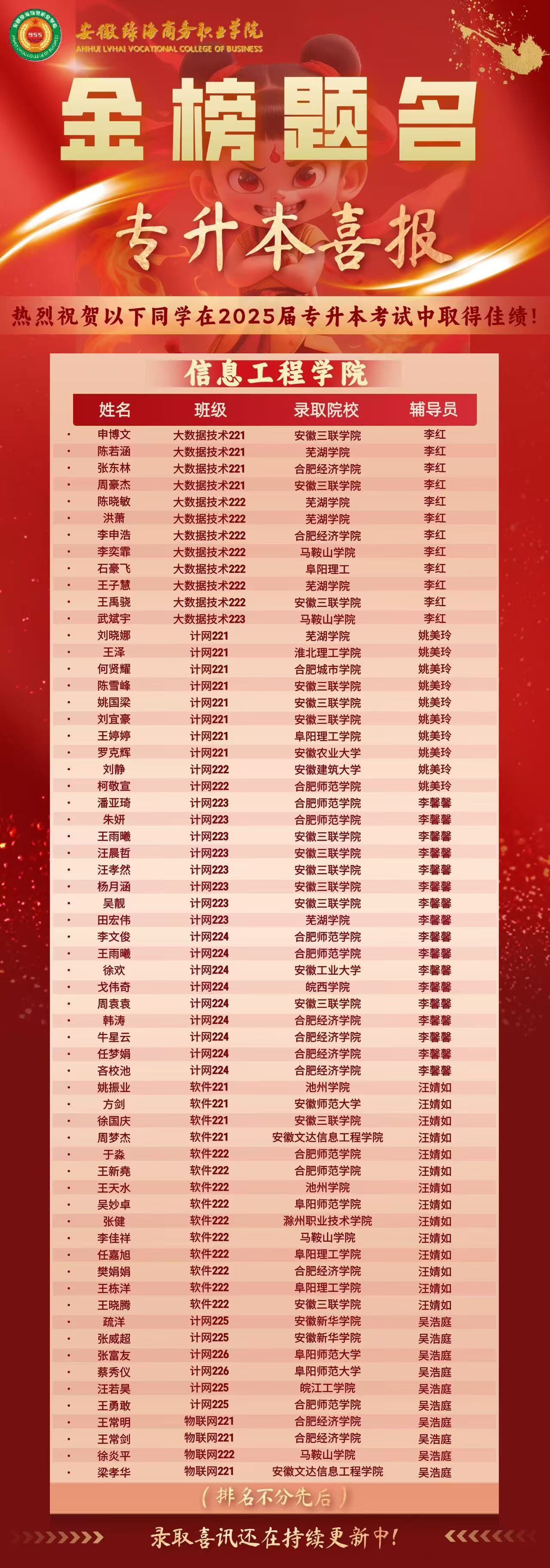 信息工程学院2025届“专升本”喜获佳绩,我院共有63名同学成功升入本科院校,分别被安徽师范大学、合肥师范学院、安徽工业大学等高校录取!